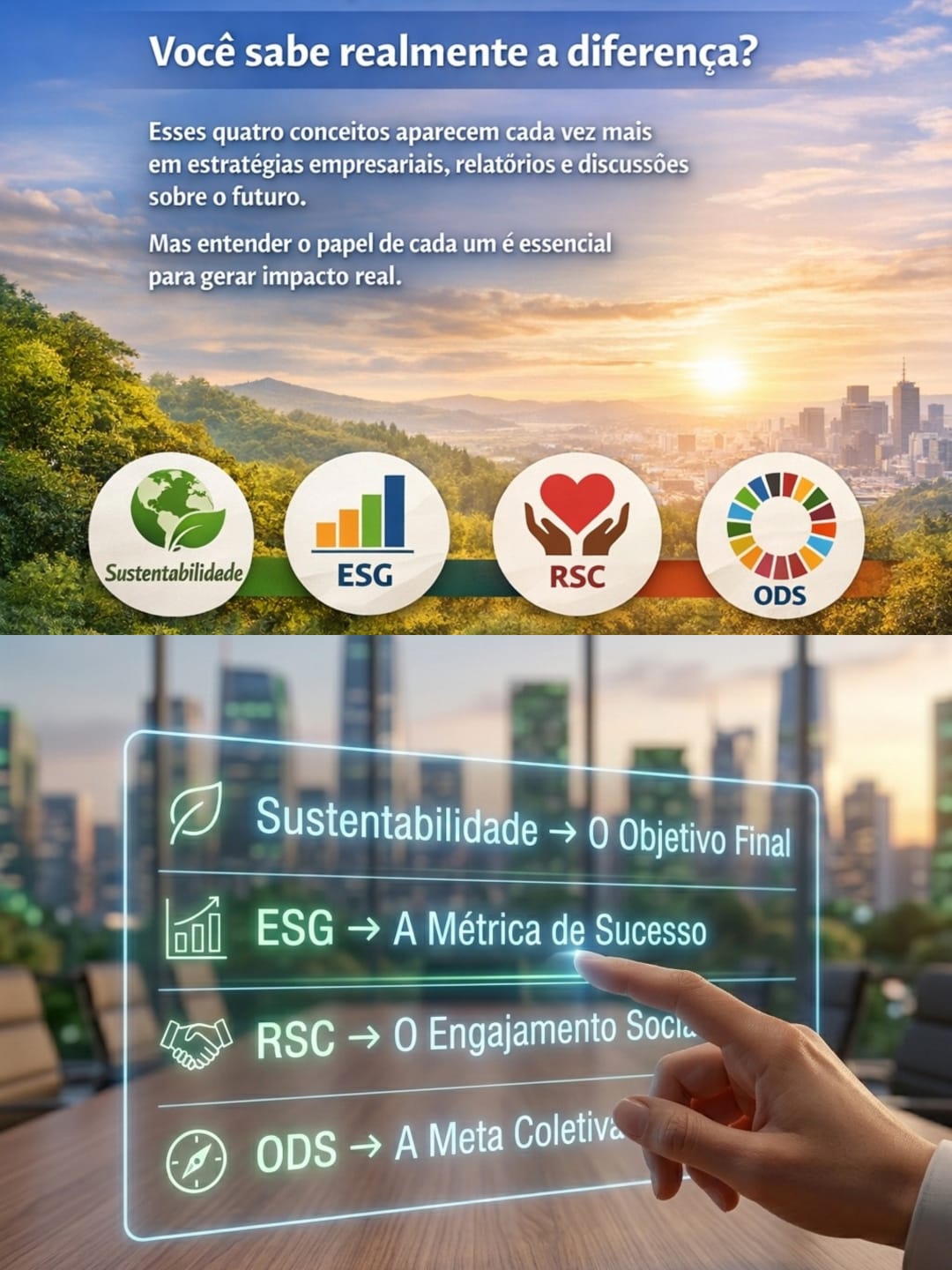 Antes de qualquer sigla, precisamos lembrar que a Sustentabilidade é o grande horizonte, o objetivo fiaal. Ela não é uma ferramenta de mercado, mas o princípio fundador: a capacidade de equilibrar as necessidades do presente sem comprometer a capacidade das gerações futuras. É o “porquê” de toda a jornada.